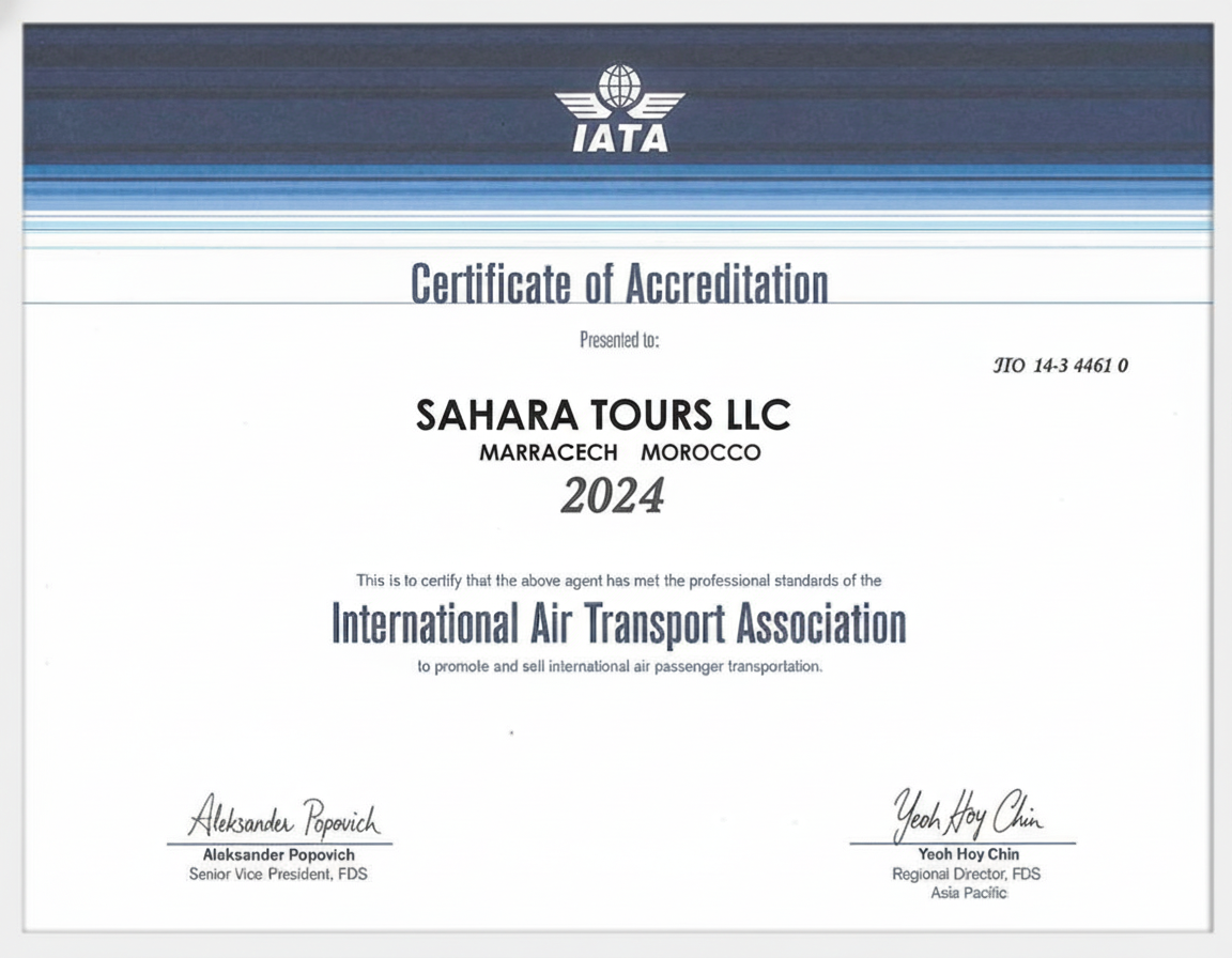 Sahara Tours LLC is proud to be an IATA-accredited travel agency, ensuring the highest standards in international travel services. Our IATA accreditation guarantees secure, reliable, and professional booking solutions for flights, tours, and travel packages worldwide. Trust Sahara Tours LLC for seamless travel planning and expert guidance for your adventures in Morocco and beyond.